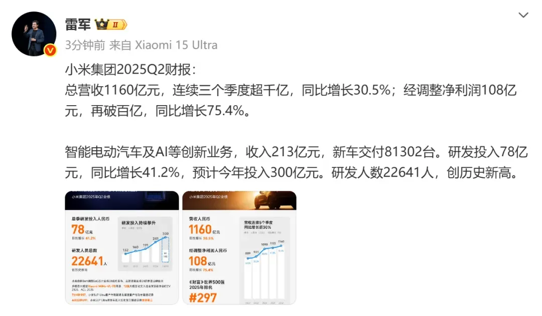 8月19日晚,在二季报发布后不久,小米创始人、董事长兼CEO雷军和小米集团合伙人、总裁卢伟冰双双发文“晒”财报。