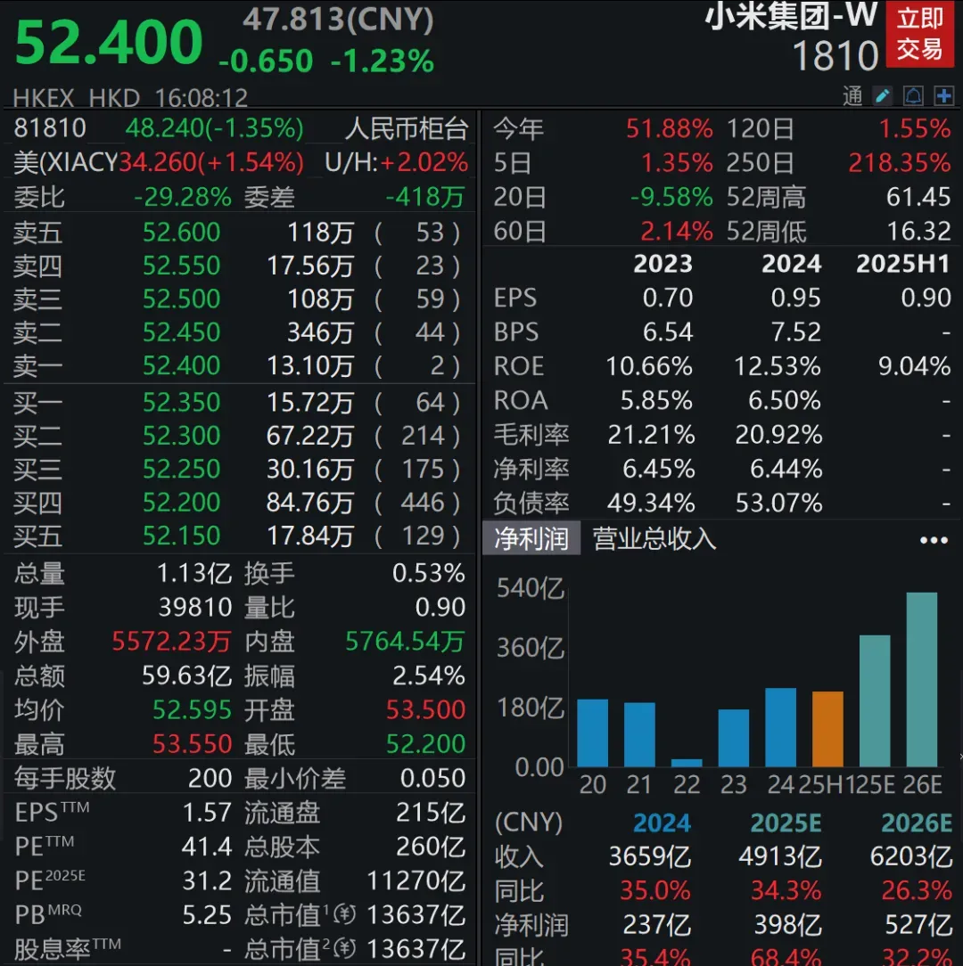 截至19日收盘,小米港股股价报52.4元,跌1.23%,总市值1.36万亿港元,相比6月27日61.45港元的近期高点跌近14%。