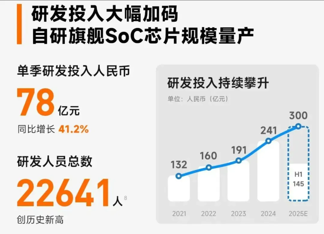 在芯片研发方面,小米财报指出,研发投入大幅加码,自研旗舰SoC芯片规模量产。单季研发投入78亿元,同比增长41.2%,研发人员总数22641人,创历史新高。